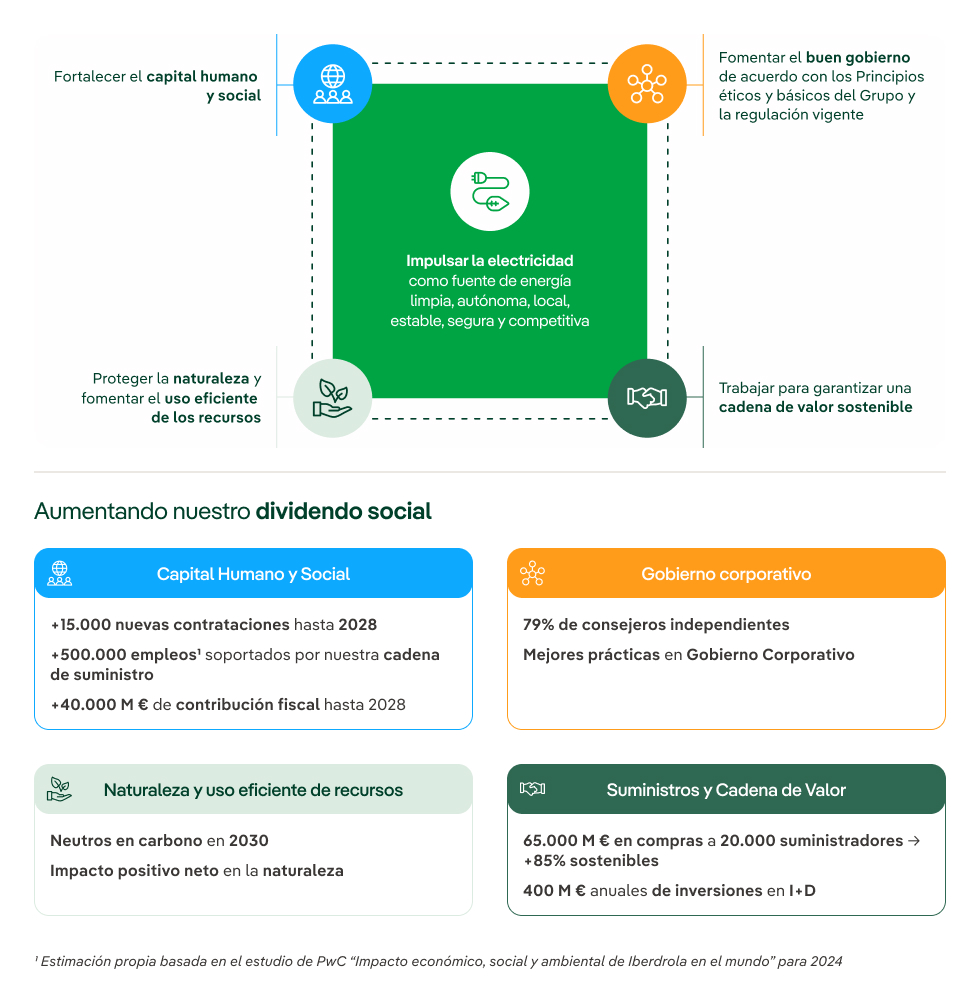 En Iberdrola trabajamos para construir un modelo energético eficiente, saludable y accesible, poniendo el bienestar de las personas y la preservación del planeta en el centro de nuestra actividad. Para lograrlo y para anticiparnos a este contexto, hemos reforzado nuestro compromisos con un Plan Estratégico transformador de 58.000 millones de euros de inversión entre 2025 y 2028 que destinaremos al impulso de la electrificación, especialmente de las redes de distribución y transporte de energía. También continuaremos nuestros esfuerzos para aumentar la capacidad de producción energética y su almacenamiento, superando los 60 GW de capacidad instalada en 2028.