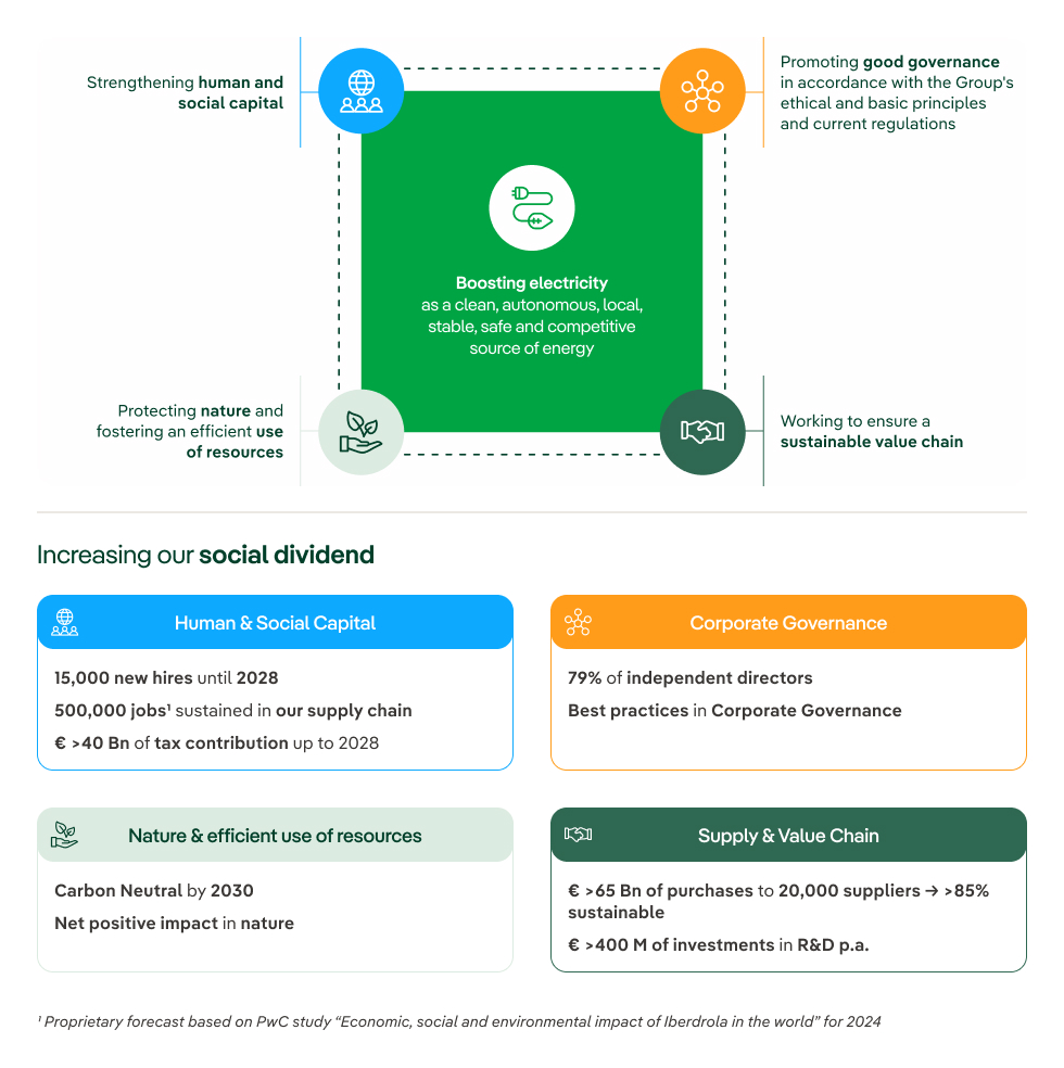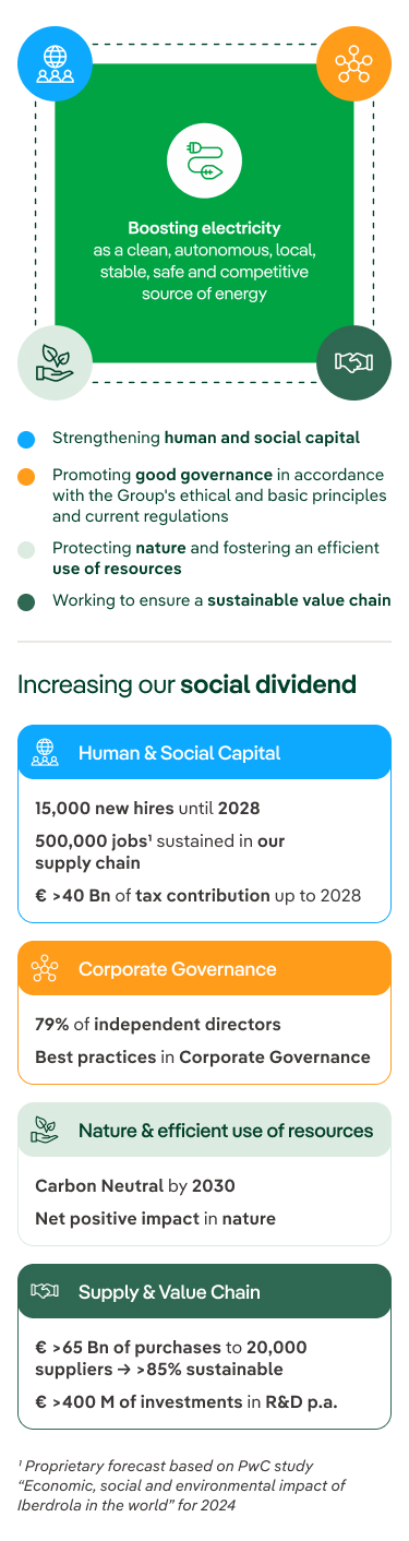 At Iberdrola, we are working to build an efficient, healthy and accessible energy model, placing people’s wellbeing at the centre of our activity. To achieve this and anticipate the evolving context, we have reinforced our commitments with a transformative Strategic Plan 2025-2028, involving €58 billion of investment, which will be directed to driving electrification, especially of distribution and transmission energy networks. We will also continue efforts to increase energy production capacity and storage, surpassing 60 GW of installed capacity by 2028.