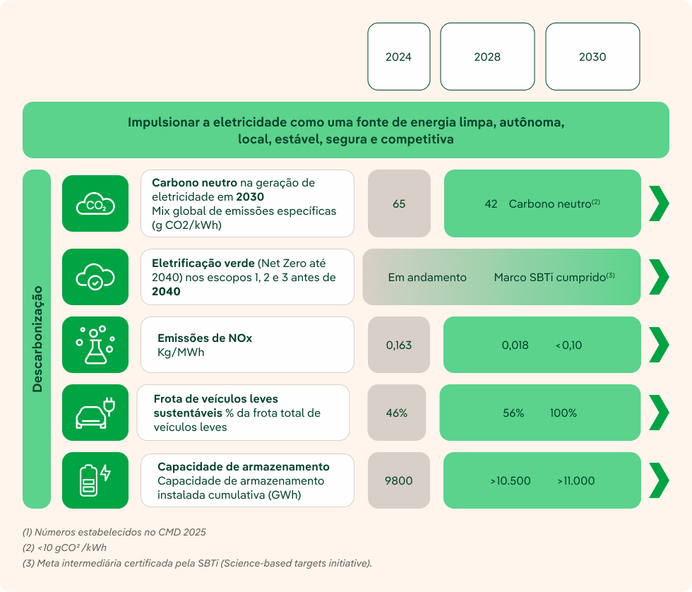 Como pilar estratégico para alcançar esse objetivo, ela se apoia no plano de investimentos do Grupo, baseado em iniciativas de inovação voltadas para a descarbonização do mix energético, para aumentar sua resiliência e consolidar sua liderança em energias renováveis, redes inteligentes, armazenamento eficiente e implantação de soluções de descarbonização para o cliente.
