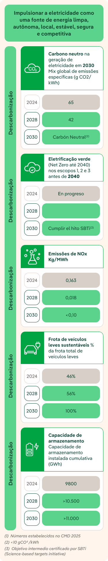 External link, opens in new window. estabelece um roadmap ambicioso para alcançar a neutralidade das emissões de carbono equivalente do escopo 1 em 2030 e zero emissões líquidas de CO₂ equivalente em todos os escopos antes de 2040. As emissões do Escopo 1 são emissões diretas de gases de efeito estufa provenientes de fontes pertencentes e controladas por uma organização, enquanto as emissões do Escopo 2 são emissões indiretas de GEE associadas à compra de eletricidade, vapor, calor ou refrigeração, conforme definido pela Agência de Proteção Ambiental dos EUA. Isso significa que, até 2030, a Iberdrola buscará alcançar a neutralidade nas emissões diretas da geração de eletricidade.